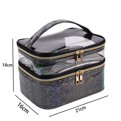 Cette trousse double couche offre une première couche transparente pour un aperçu rapide de tes produits et une deuxième couche pour ranger tout ton maquillage. Sa conception portable avec anses la rend facile à transporter, que ce soit chez toi ou en voyage. De plus, elle est imperméable, protégeant ton maquillage des éclaboussures et des accidents.